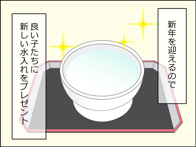 新年を迎えるにあたってよい子たちに水入れをプレゼントしました。