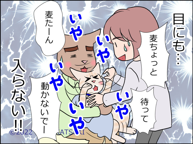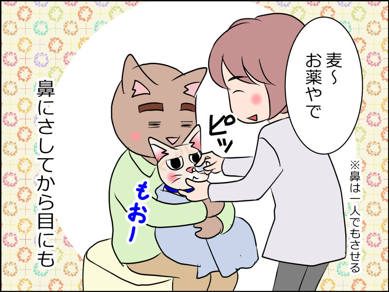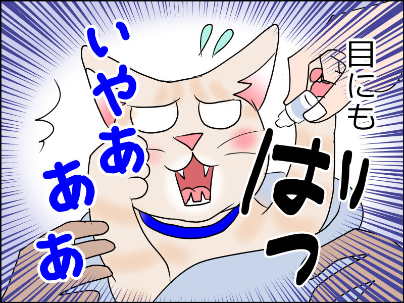 我が家のキーちゃんが初めて目薬刺された時、あまりに予想外の出来事だったようで、目を見開いたまま瞬きも出来ずに固まって上向いてました(笑)