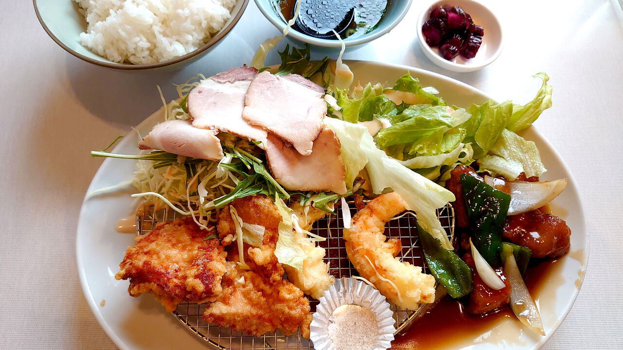 揚げたてのさくさく唐揚げ、エビ天、酢豚、焼き豚+ご飯大、スープ、漬物