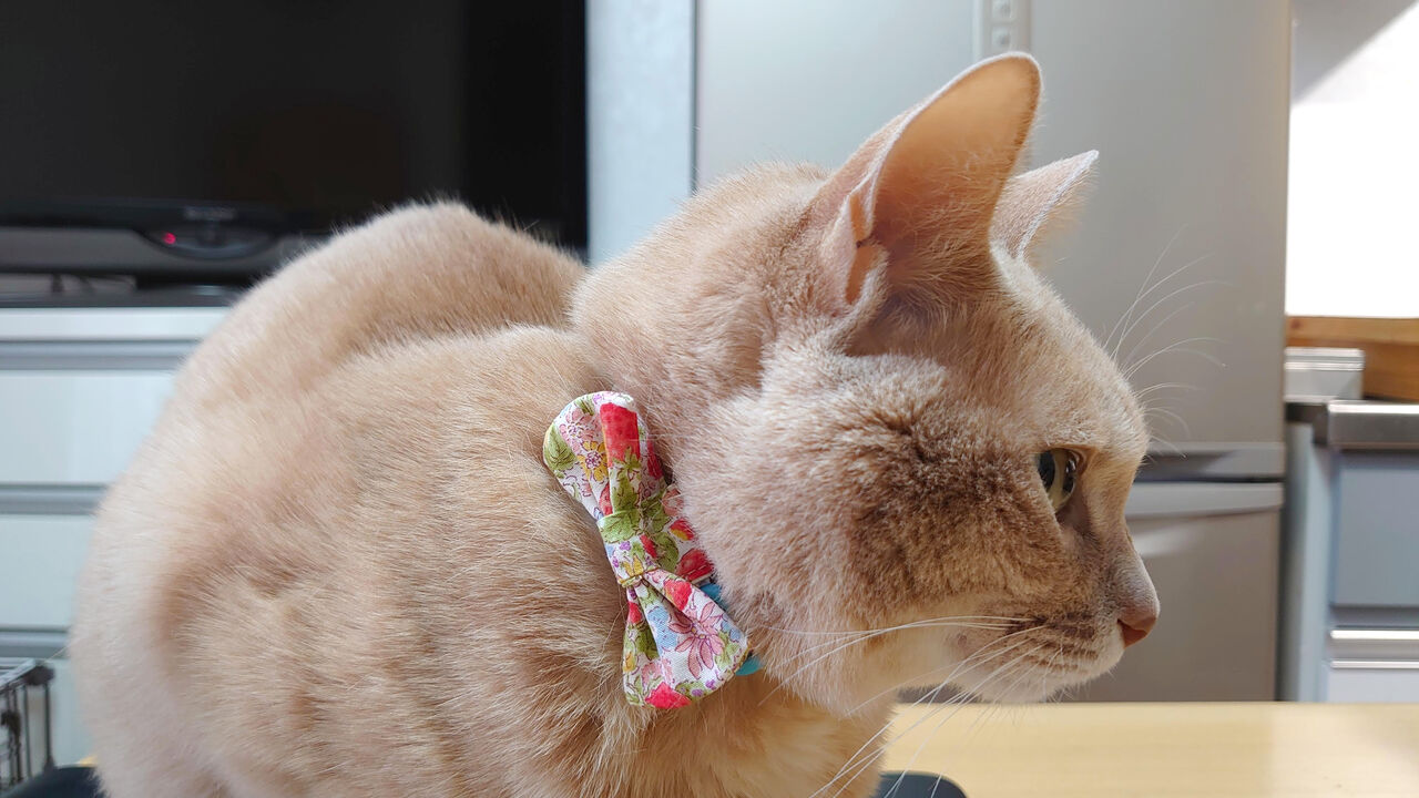 リボンももっと大きくしたりレースをつけると派手で可愛いのですが、毛づくろいの時にひっかけたり