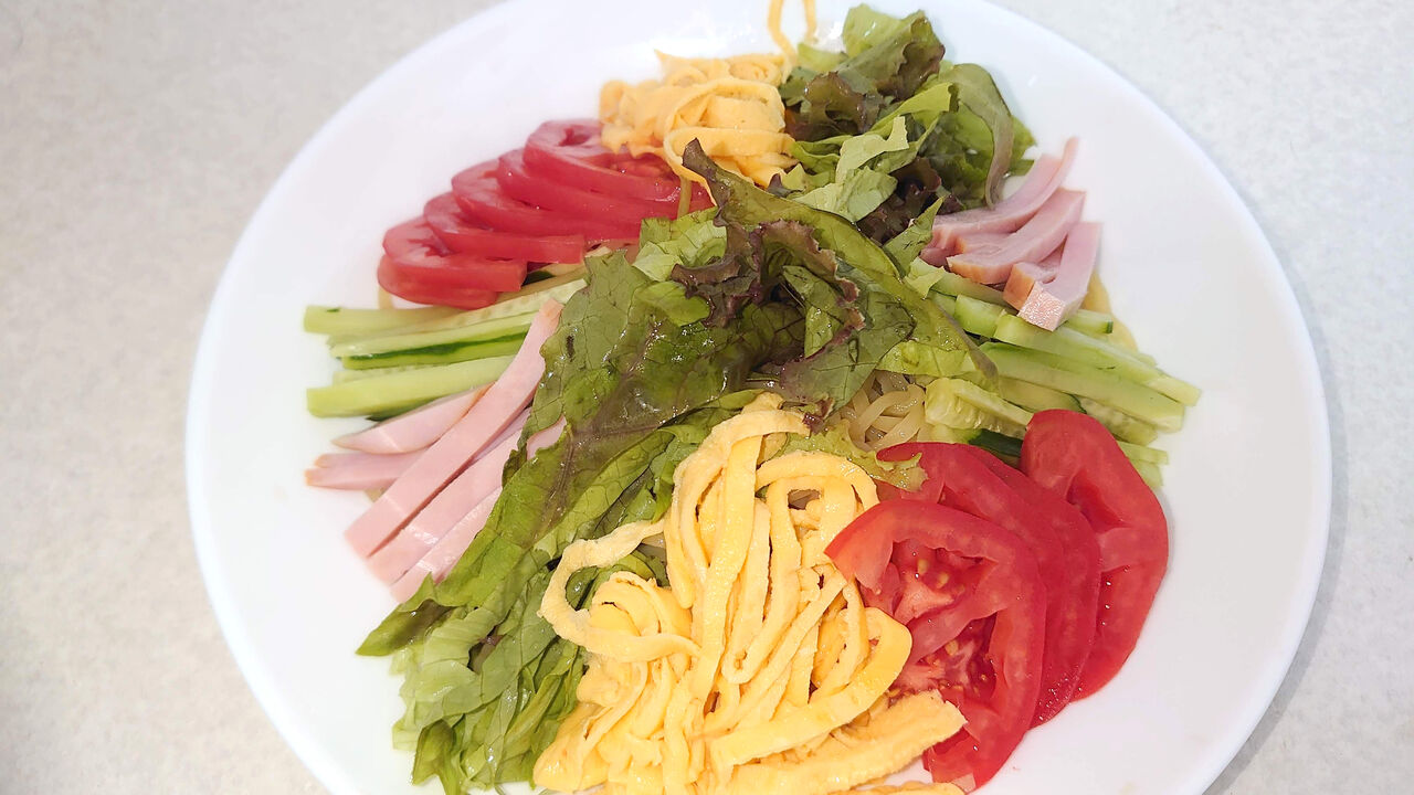冷やし中華、我が家はもやし、茹でたエビ、ササミ、カニカマを入れたりします。