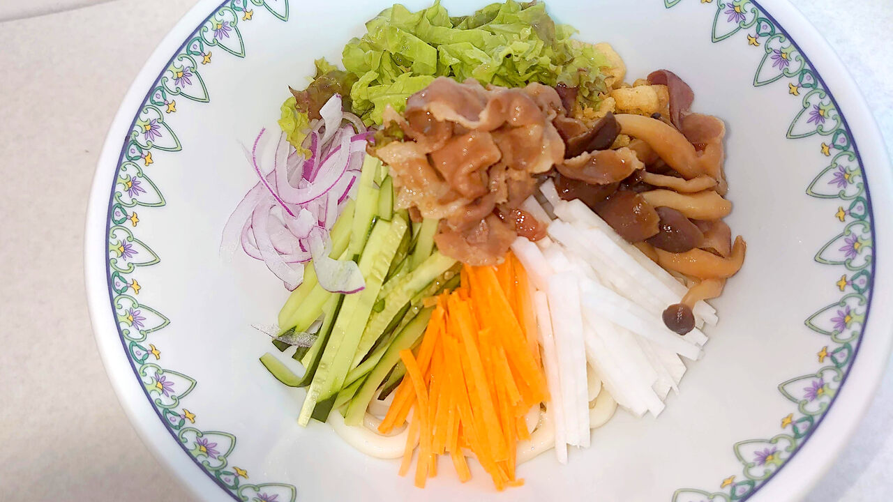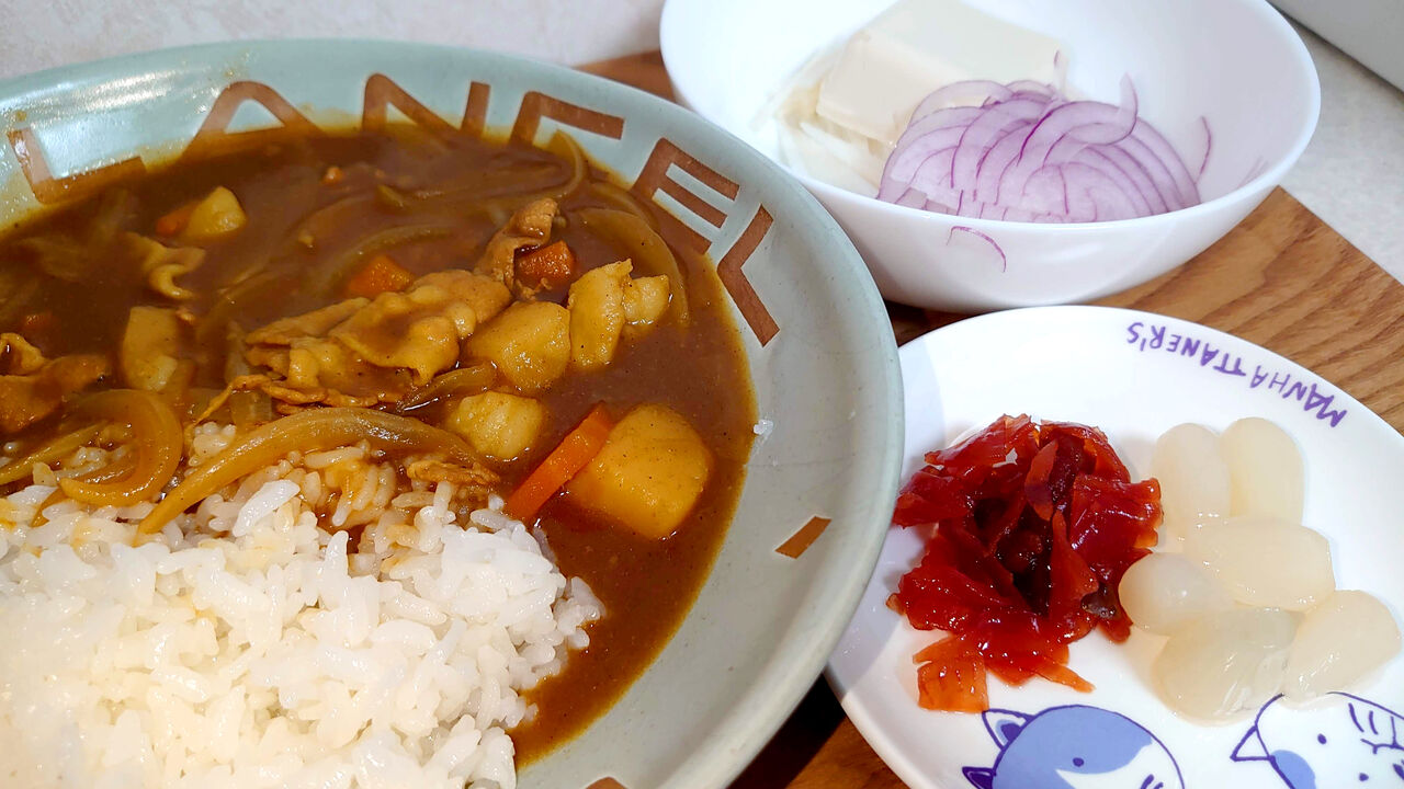 山芋たんざく+豆腐+紫タマネギの小鉢はドレッシングをかけるか醤油をかけるかが悩みどころ