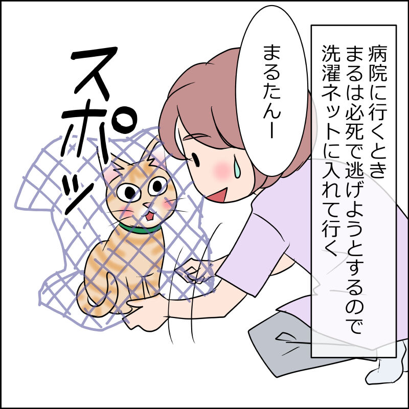 まるは病院で必死で逃げようとするので洗濯ネットに入れています。