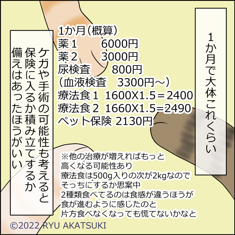 (一年更新)ペットは自費だから、毎回保険証見せて3割支払いで助かってます。冬になると膀胱炎にもなりやすいから、療法食も必須ですねー。ウェットにより顎に黒ニキビが出来るので、毎回拭いてます( ; ; )(ウチの子は一緒にベッドで寝てくれないから、うらやまし〜😽)