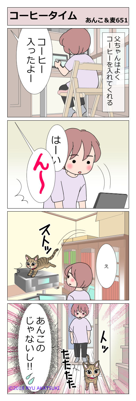 あんこ&麦651「コーヒータイム」 2018年08月07日 カレンダー配布中8月は→ 本日二回目の更新です。 →一回目「猫用替え襟作ってみました」はこちら 父ちゃんはよくコーヒーを入れてくれます。 ポットに入れて出前の時も呼ばれる時もあります。 声を大にして言いたい! あんこしょんぼり あんこの「あ」の字も おやつ ... 続きを読む