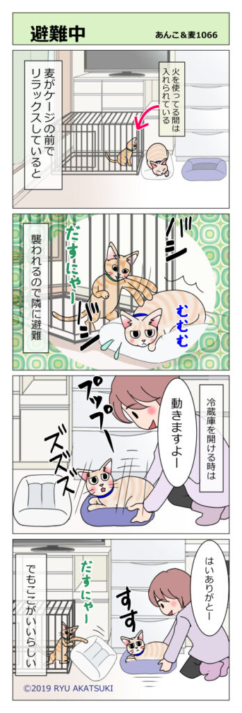 あんこ&麦1066 避難中(猫まんが) 2020年01月31日 火を使う時は危ないのでまだケージに入れています。出たい気持ちはわかるけど! 反対側にもあるのにねー 反対側に赤いベッドもあるのにメインはこちら。ケージが片付けられたらもう少しスッキリするのですが…。まるもだいぶわかってきてるのですが、幼児と同じで、 ... 続きを読む