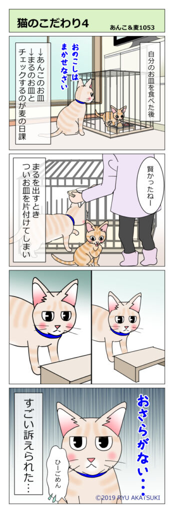 あんこ&麦1053 猫のこだわり4 (猫まんが) 2020年01月13日 ついつい片付けてしまったのです。 すごい考えてた… 慌てて片付けたばかりのお皿を見せてチェックして頂きました。フチにちょっと残ってたウェットをペロペロしてご満足いただけたようです…。 こまったものです あんこもまるもほぼ残さないので麦がいっぱい ... 続きを読む