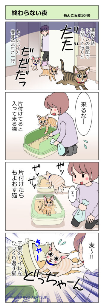 あんこ&麦1049 終わらない夜(猫まんが) 2020年01月07日 深夜2時。ざっざっざっ誰かがトイレの砂を混ぜる音がします。 ヤメテー 大大小小どっちゃーんみたいな…2時だと掃除機かけられないし! 子猫のトイレを使うのは別にいいんだけど…大きいトイレと同じように体重かけちゃ無理… なんのことかなしらないにゃ ... 続きを読む