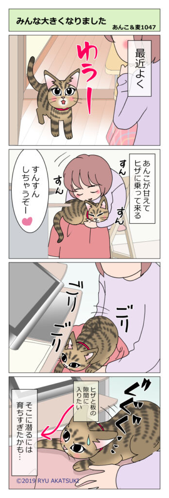 あんこ&麦1047 みんな大きくなりました(猫まんが) 2020年01月04日 最近よく甘えて来るあんこ。電気ひざかけのせいかもしれません。 頑張ったけど無理だった 大きくなったのはまるだけじゃなかったようです。 甘々あんこの時は爪も切れます。ゴロゴロも言ってくれます。すんすんし放題です。こんなことも出来ます。 あんこなん ... 続きを読む