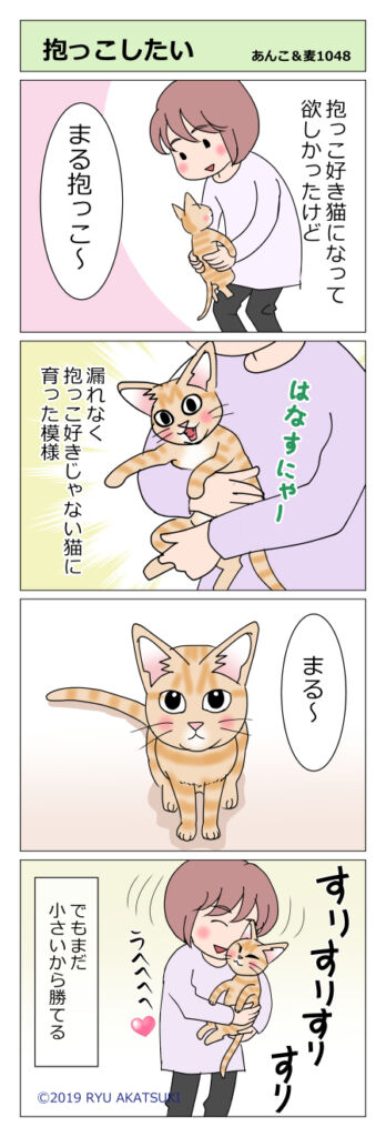 あんこ&麦1048 抱っこしたい(猫まんが) 2020年01月06日 あんこも麦も抱っこは嫌い。せめてまるはと思ったのですが! まだまだ楽勝 まだまだすぐ捕まえられるし小さいけどいつか卒業しちゃうと思うと寂しい… とーちゃんにつかまったー 今日体重計ったらなんと2.8キロ!最初が800gで三倍以上になりました!すごいな ... 続きを読む