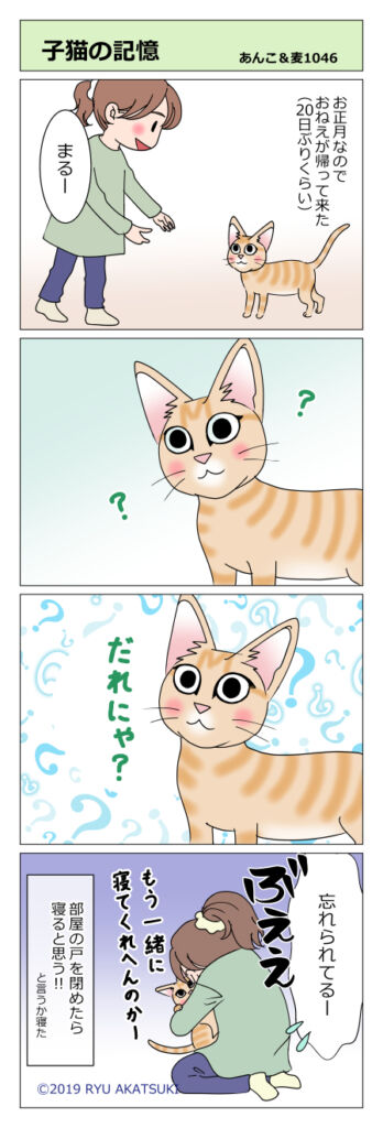 あんこ&麦1046 子猫の記憶(猫まんが) 2020年01月03日 自由になったまる。お正月でおねえが帰ってきました。 割とドライだった(*´ω`) きっと成長が早いので毎日色んなものが更新されてるんでしょうね~。だから新しいおうちでもすっと馴染める。そんな気がします。 毎日見てるので大きな変化はありませんが、 ... 続きを読む