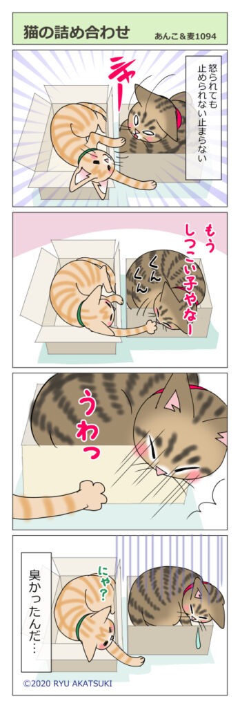 あんこ&麦1094 猫の詰め合わせ 2020年03月11日 311東日本大震災から9年。黙とうを捧げます。 箱に入ってご機嫌なあんこ。まるが邪魔をするので並べておいてあげました。 どんなニオイ? まあ怒られてもひるまないのですが… 猫の詰め合わせいかがですかー きになるにゃ そーっ ・・・ なにもない ... 続きを読む
