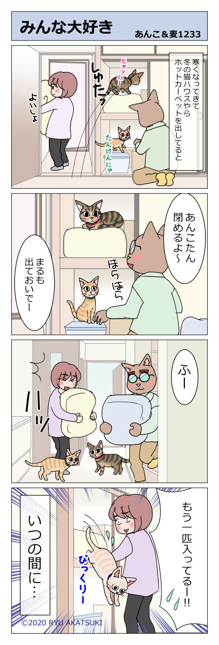 あんこ&麦1233 みんな大好き 2020年10月12日 急に涼しくなりました。押入れを開けてホットカーペットやら仕舞ってた猫ハウスやらを出してると… 下にいると思ってた麦もいつの間にか入ってましたみんな押入れ好きすぎるやろー あぶなかったです 普段は入れないように扉を閉めたりしてます入れるチャ ... 続きを読む