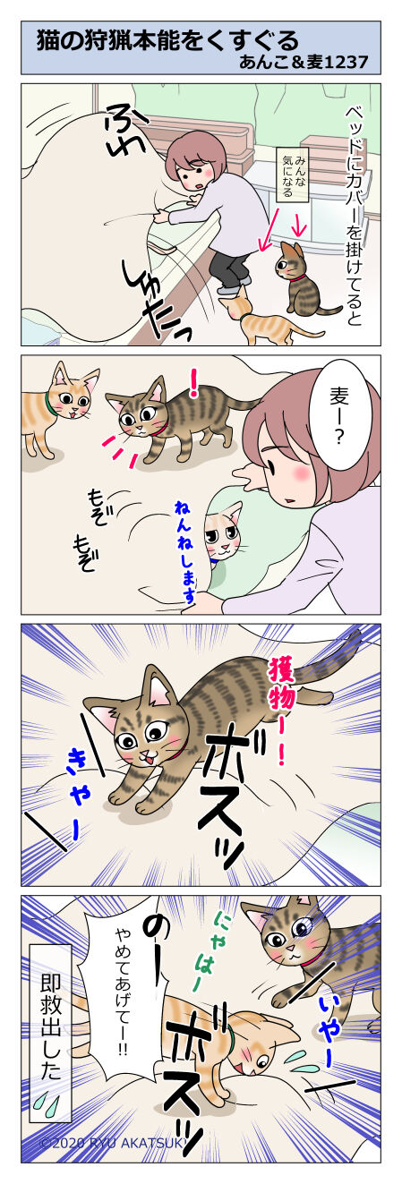 あんこ&麦1237 猫の狩猟本能をくすぐる 2020年10月19日 みんな大好きベッドカバー掛けるときも気になるようで… 麦が逃げれば逃げるほどみんなが刺激されるのですぐ救出。びっくりした…。 みんなひどいです まるはおねむにゃ あんこ悪くないもん いや、悪いと思う!悪気はないけどね… 無事救出出来 ... 続きを読む