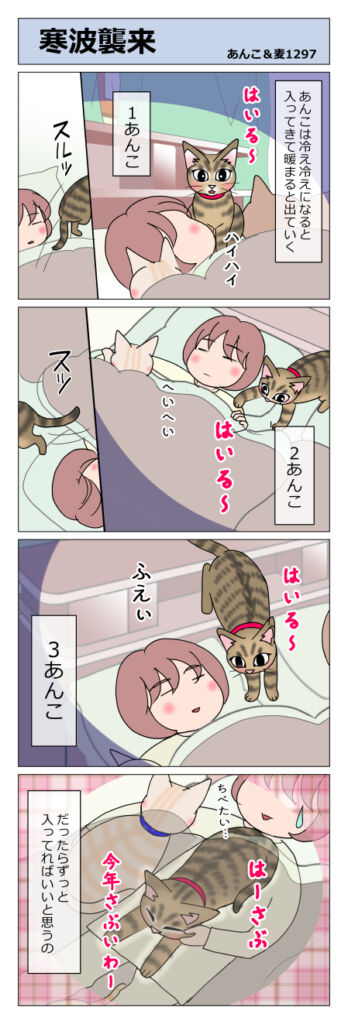 あんこ&麦1297 寒波襲来 2021年01月15日 あんこの出入りも極めつつある今日この頃…今年一番の冷え込みが予想された朝のこと 一晩に3あんこ(´・ω・`)新記録 そんなに寒かったらずっと居ればいいじゃない あんこにはあんこの都合があるねん 毎回冷たいですせっかく暖めたのに…母ちゃんは寝 ... 続きを読む