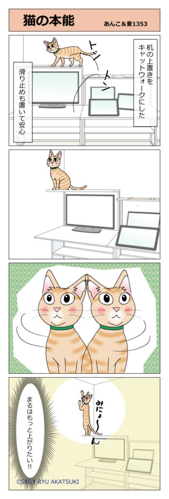 あんこ&麦1353 猫の本能 2021年04月10日 https://ankomugi.com/archives/post-14777.html 机の上置きを猫用にしました。滑り止めも置いてもう安心。 猫めえええええ。 壁側を登れるようにすることも考えたのですが…そうなると次はドアに登ってしまいます。ドアの上についてるドアストッパーが欲し ... 続きを読む