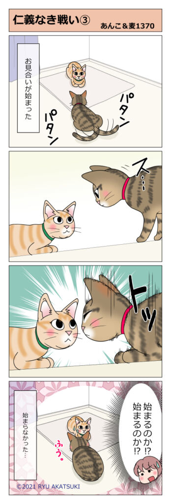 あんこ&麦1370 仁義なき戦い?③ 2021年05月05日 https://ankomugi.com/archives/post-15144.html 前回のお話はこちら まるがいて、あんこがいて、お見合いが始まりました。緊張が高まります。 母さん手に汗握ったわー やると思った? なぜわざわざそこに。 微妙に目線がずれてるせいでしょう ... 続きを読む