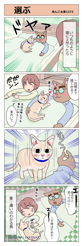あんこ&麦1373 選ぶ 2021年05月10日 ある夜のこと。いつものように母ちゃんが寝に行くと… 父ちゃん残念… 父ちゃん寝返り打たないか心配だったけど一回くらい練習してみる?なんて思ってたのですが… ちがいのわかるおとこです どんな時も腕枕してきたしね肩が痛かった時は痛み止め打っ ... 続きを読む