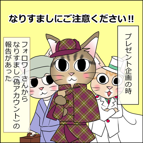 なりすましにご注意ください 2022年10月15日 本日2回目の更新です!一回目はこちら プレゼント企画も終わったので注意喚起も兼ねて書きました。最近はツイッターとかでもプレゼント企画あるので描きました。プレゼント企画するとほぼ毎回沸きます。最初のころは騙されてフォローバックされた方もいたようです。怖いのは ... 続きを読む