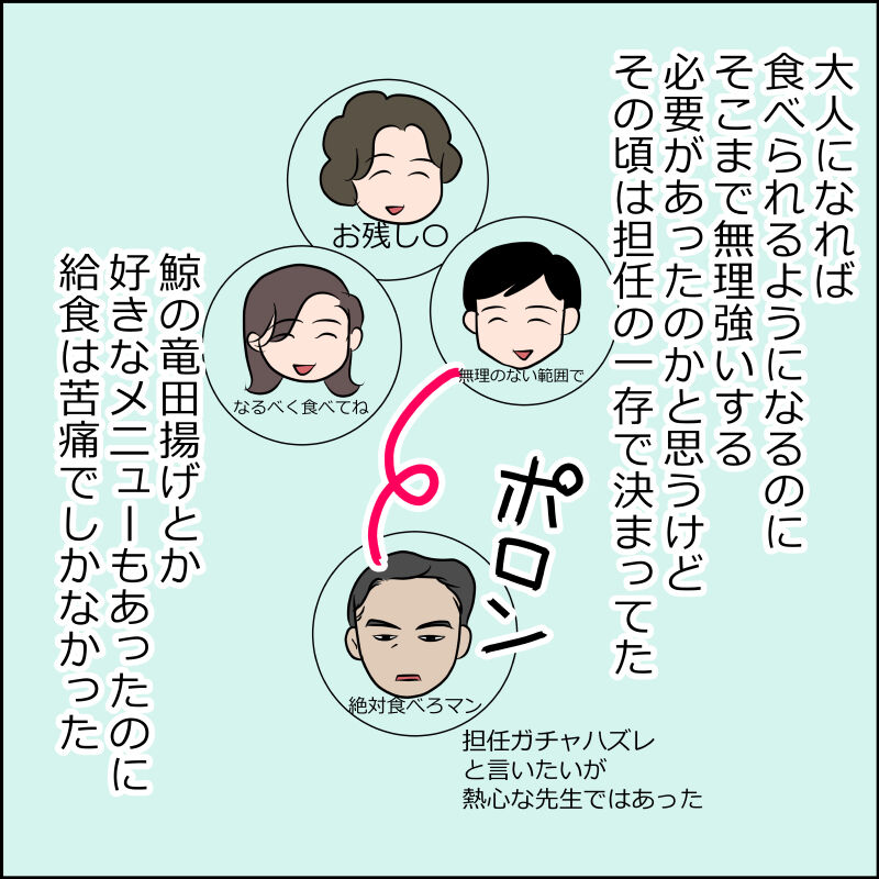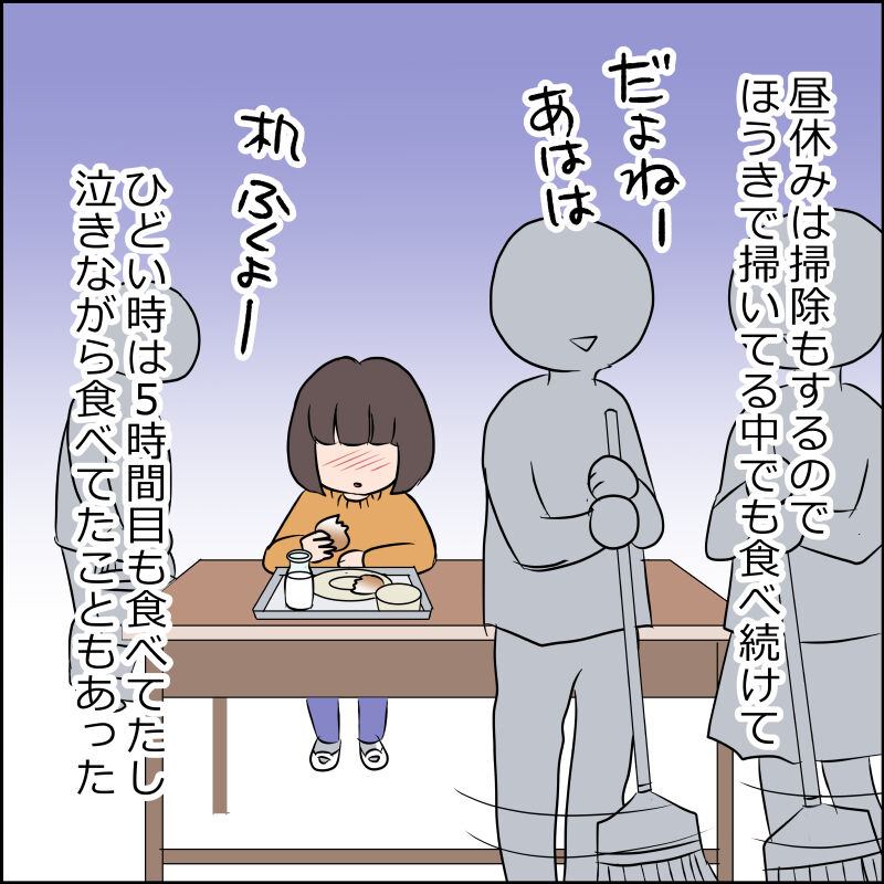いつも泣きながら掃除時間もホコリの中給食を食べていました。昭和の時代食べ物を残すのは罪悪でしたね。アレルギーとかもあまり認知されてなくて今思えばアトピーのひどい子もいましたよね…