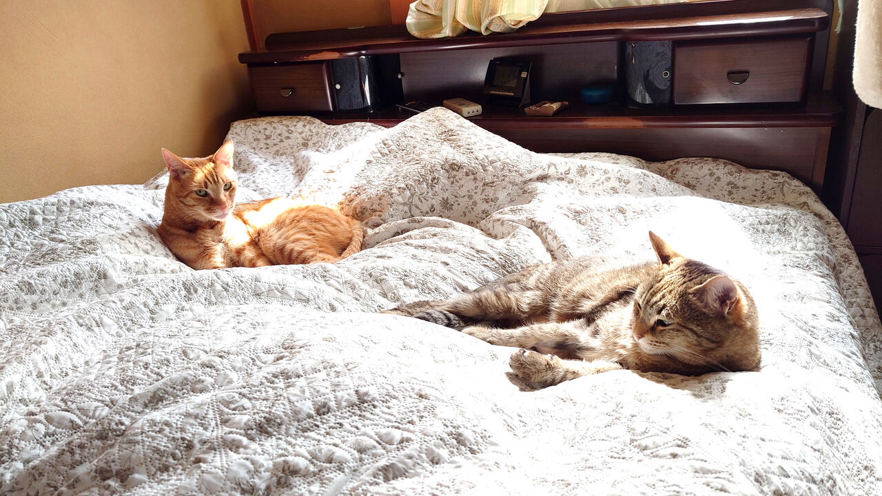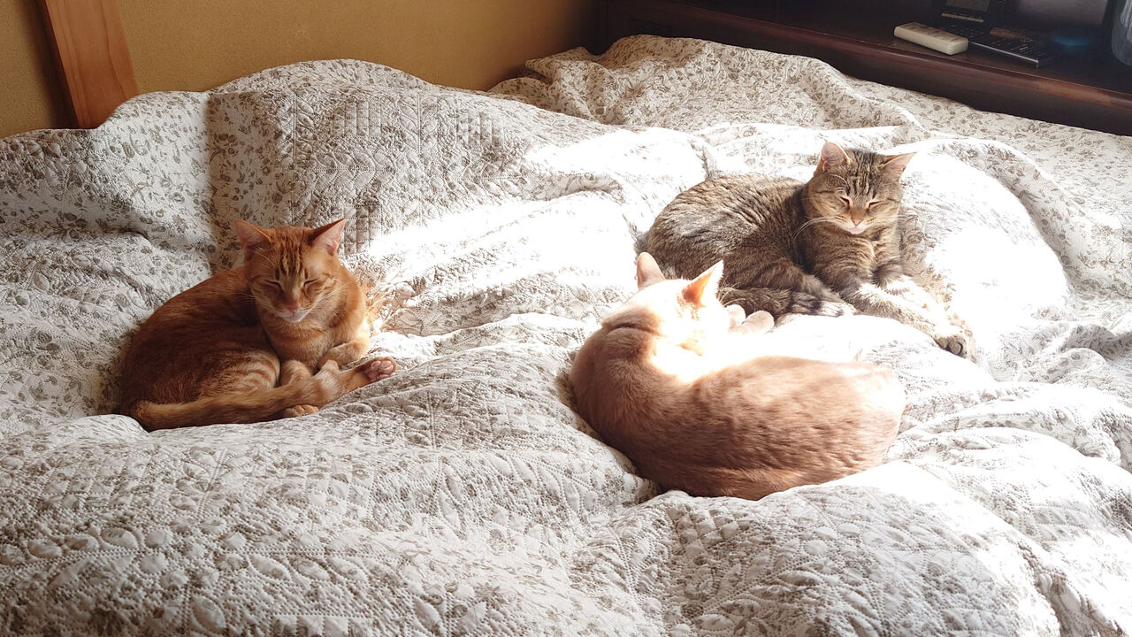 猫たちはこのベッドカバーの上がお気に入り。