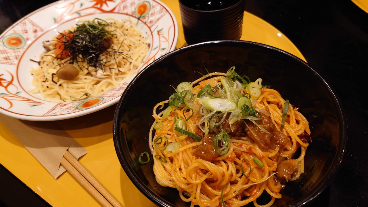 牛すじと九条ねぎのミートソース&明太子と湯葉と丹波しめじの青じそ風味