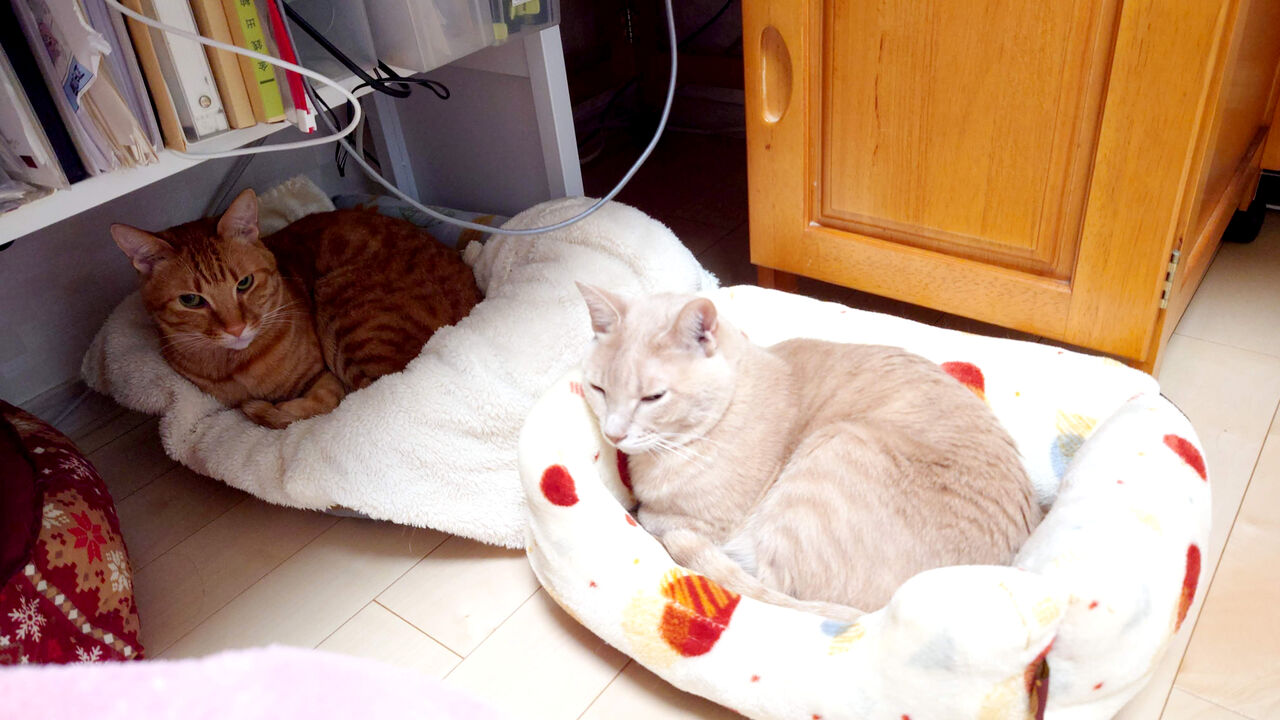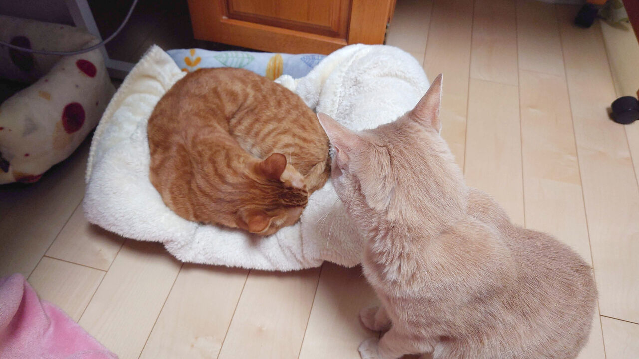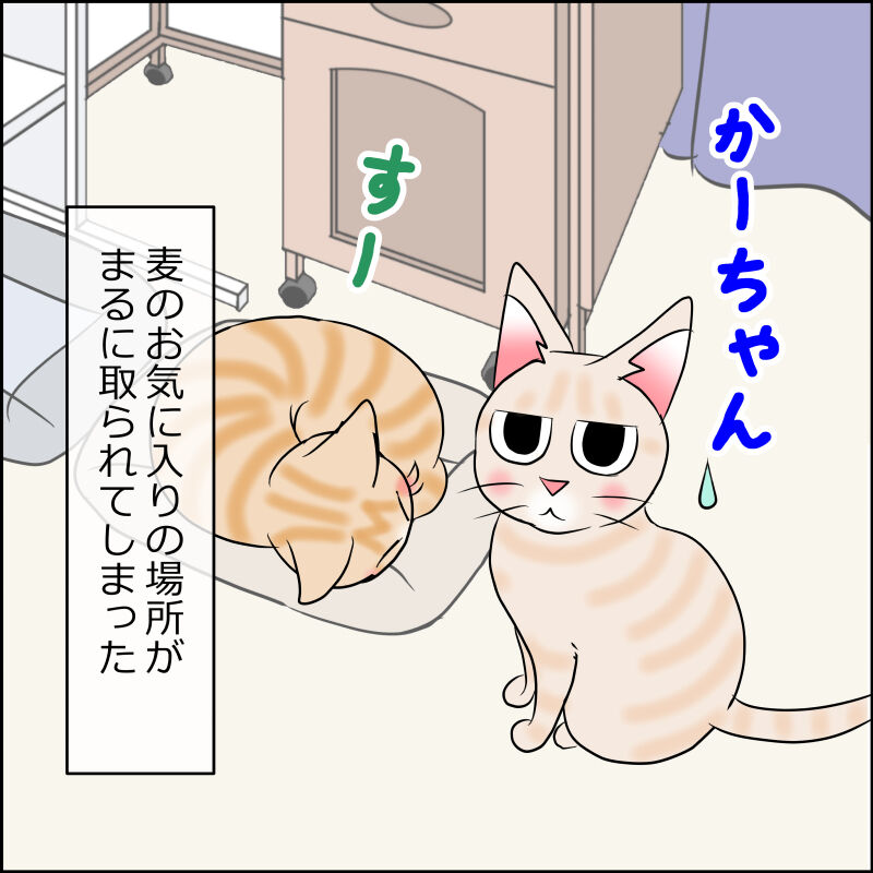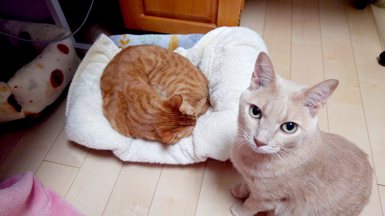 麦の今のお気に入りは母ちゃんの足元に置いた猫ベッド。