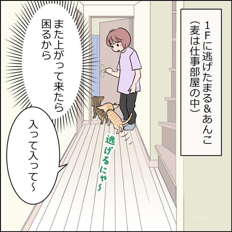 下に逃げたあんことまる。