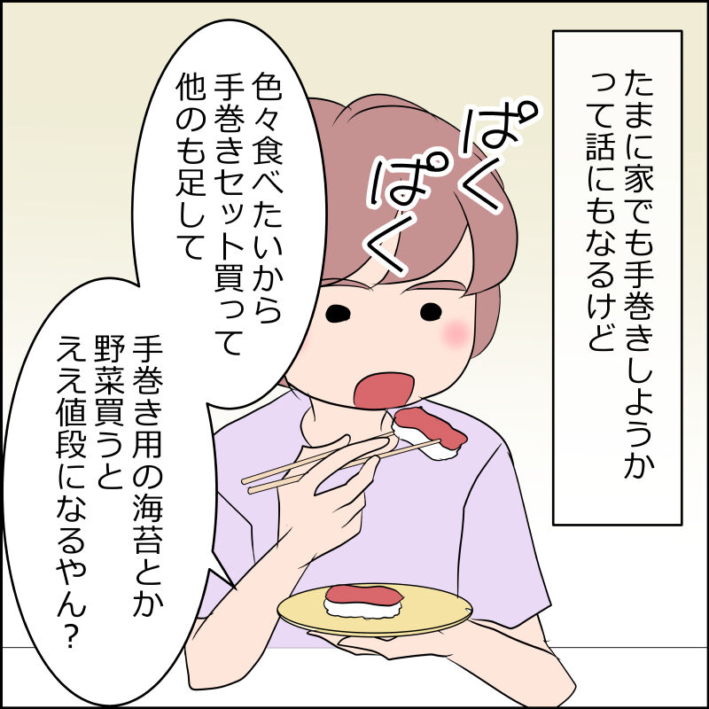 我が家は日によって、最大10人になるので、買って来て家で手巻きする事もあるけど、酢飯を7〜8合格作らなければならないから、とても大変です。(それでも、外でたべるよりは少し節約)