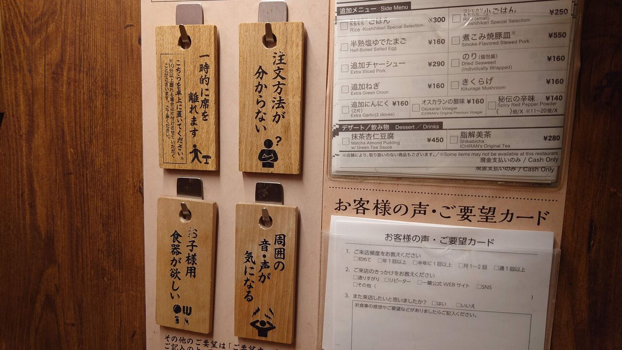 席を離れる時のフダとか色々なフダも席に置いてあります。