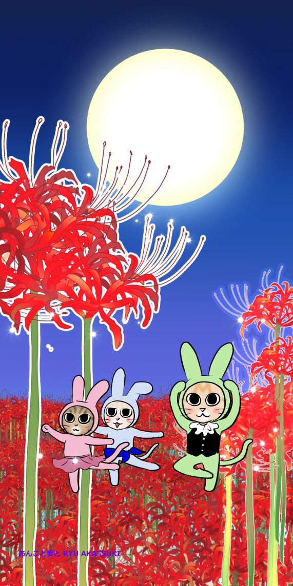 曼珠沙華の前で、うさぎの着ぐるみを着てるニャンちゃんたち、可愛いです🩷