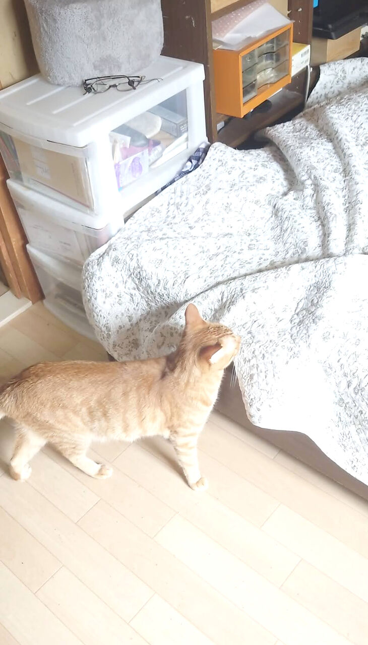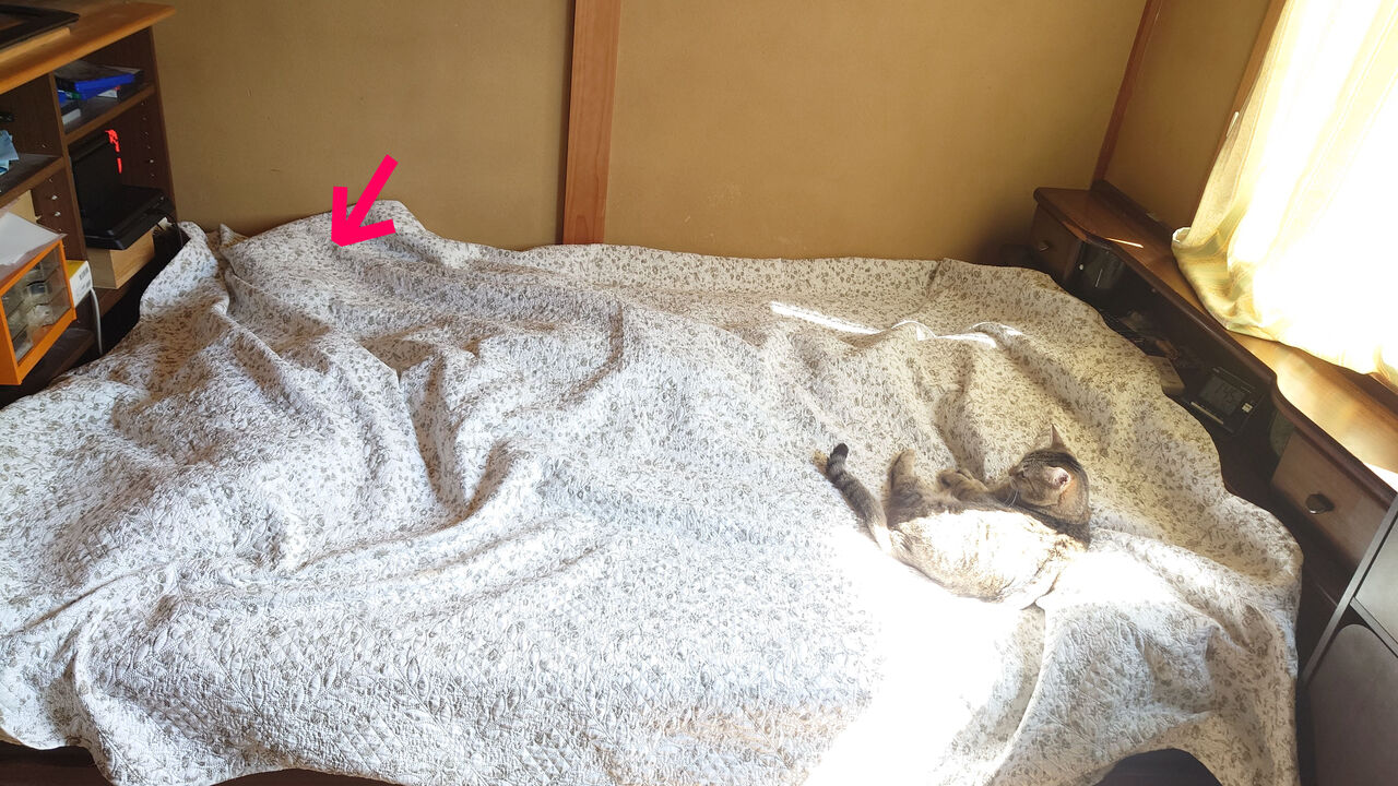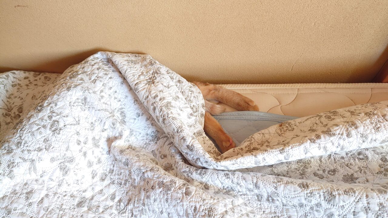 お昼寝は寝室のベッドのカバーに潜って寝ます。