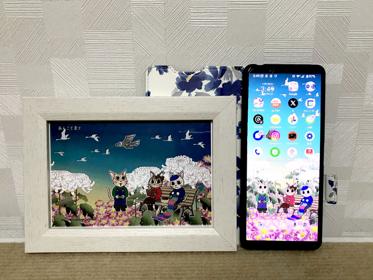 スマホは後ろからライトが当たってるのでより明るく見えて、ハガキが暗めに見えますが、ハガキも落ち着いたきれいな色です。