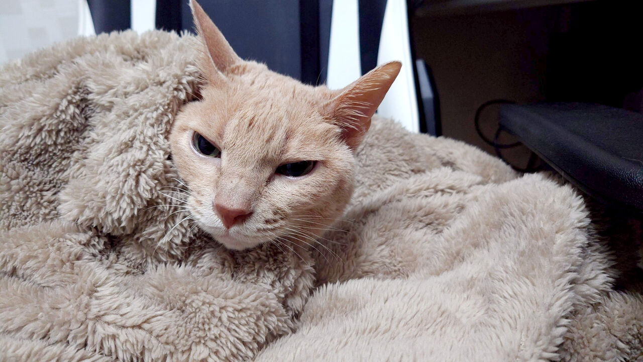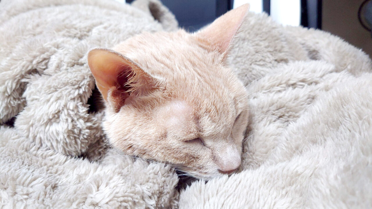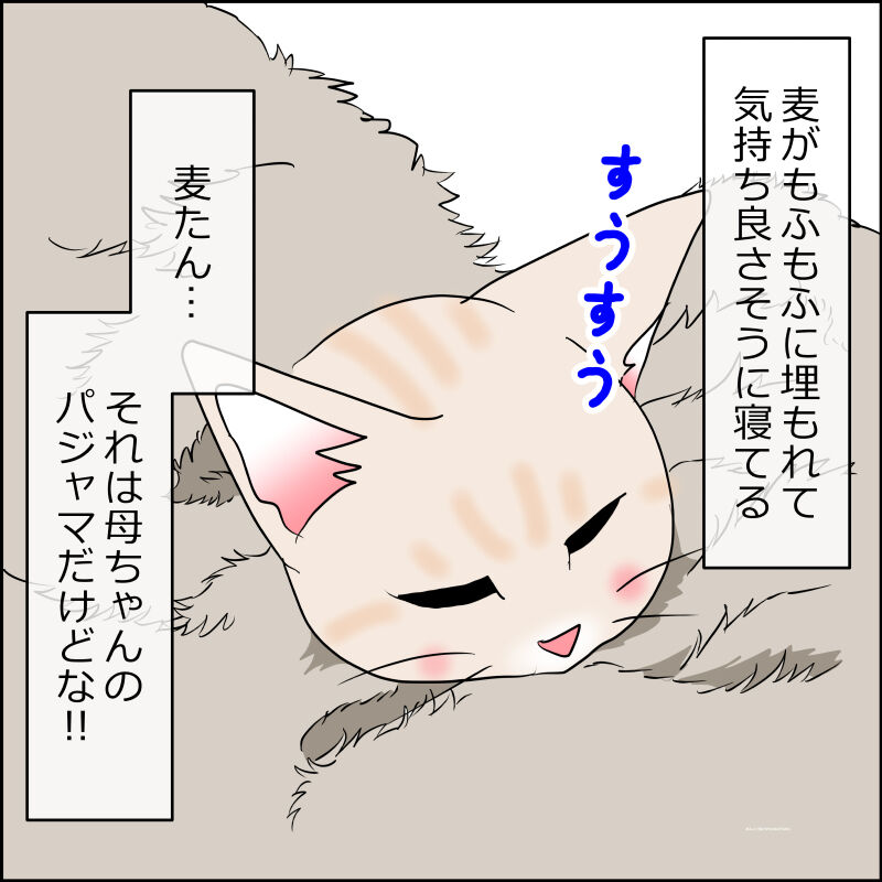 ふと見ると麦がもふもふに埋もれて気持ち良さそうに寝てました。