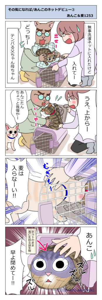あんこ&麦1252 その気になれば/あんこのネットデビュー③ 2020年11月09日 前回のお話はこちら いつもと様子が違うので病院に行くことになりました。何とかネットにも入れて… パンスト強盗… それでも逃げようとするのがすごい。 なんであんこがこんな目に 隙あらば入りたい麦を何とか阻止してやっと出発です。 もうちょ ... 続きを読む