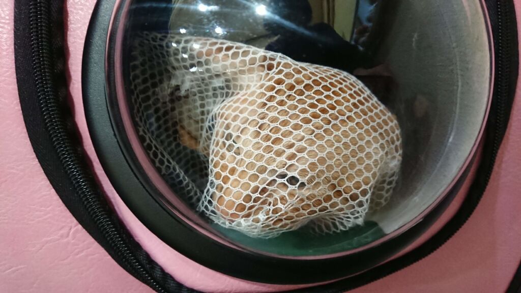 診察室で逃げようと必死になるので今回から洗濯ネットに。