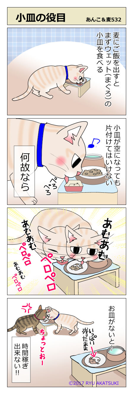 あんこ&麦532「小皿の役目」 2018年03月10日 本日2回目の更新です。 一回目はクリスタのテクスチャ作りのことを書いてます。 →興味あるかたは是非!こちらから 麦のご飯は朝以外かりかり+ウェット(マグロ)の小皿のセットです。 あんこはかりかりにウェット(マグロ)トッピングです。 最終的には行くんですけどね ... 続きを読む