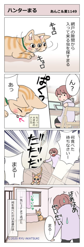 あんこ&麦1149 ハンターまる 2020年06月08日 ハンターあんこ最新話 網戸の隙間から小さな侵入者も増える時期。まるも獲物探しに夢中です 何食ったー! あんなに逃げ足の速いまるは初めて…一気に3Fまで逃げました 網戸をすり抜ける羽虫よりは明らかに大きかったそれ…一体何を食べたのか… ひみつに ... 続きを読む