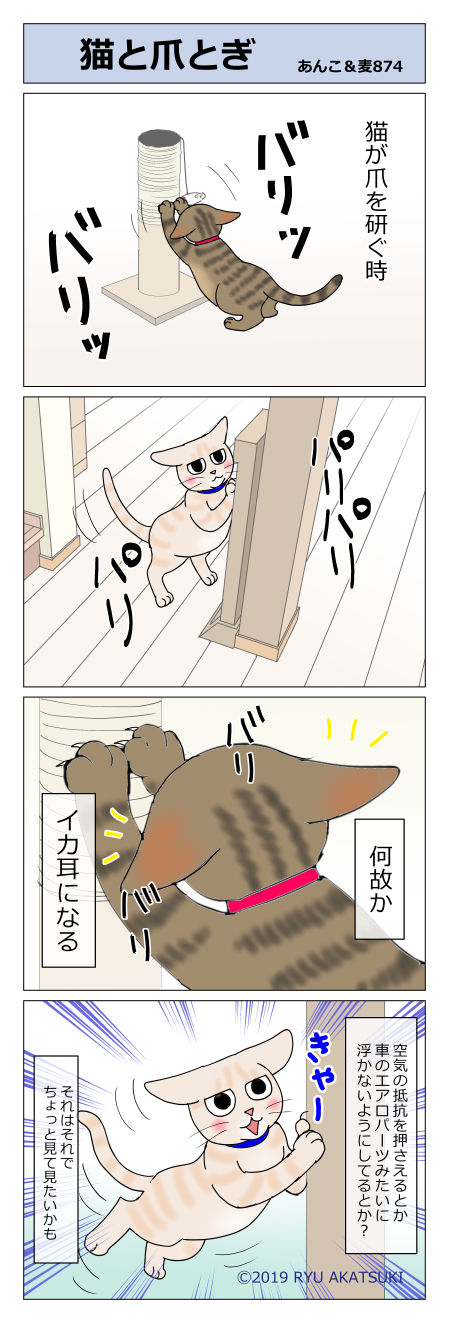 あんこ&麦874「猫と爪とぎ」 2019年05月12日 5月のカレンダーはこちら→ いんたーねっつで調べてみましたがわかりません。 誰か教えてください。 イカ耳になるのはおおむね警戒してるとか怒ってるとか。 別に普通のタイミングで爪を研いでもイカってます。 何故なんでしょう? ぱりぱりぱりぱり 前に上げた ... 続きを読む