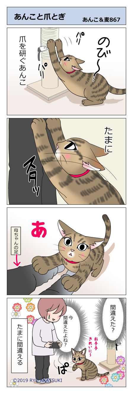 あんこ&麦867「あんこと爪とぎ」 2019年05月04日 5月のカレンダーはこちら→ あんこは爪を研ぐ時セットで脇も伸ばしてるようです。 筋肉をほぐしてるのかな? でも研がないあんこ賢い!(*´ω`) のび~ぱりぱり たまたま側に立ってたりするとつい無意識にやってしまうようです。 気が付いたときさりげなさを装 ... 続きを読む
