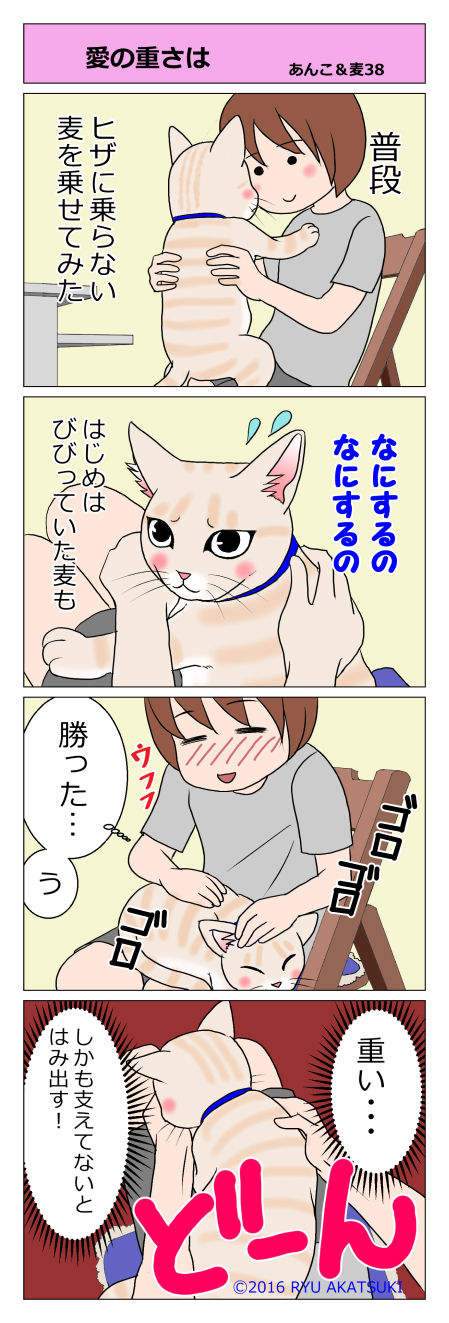 あんこ&麦38 「愛の重さは」 2016年08月07日 普段ヒザに乗らない麦。寂しいので乗せてみました。赤ちゃんの時から育ててないせいか、あんこも麦も抱っこが嫌いです。しくしくしく。せめてお膝にと乗せてみたら重かった・・・。 じどりふうにおしゃしんとってみたで バックが加工してあるのは思いっきり部屋干しの洗濯物 ... 続きを読む
